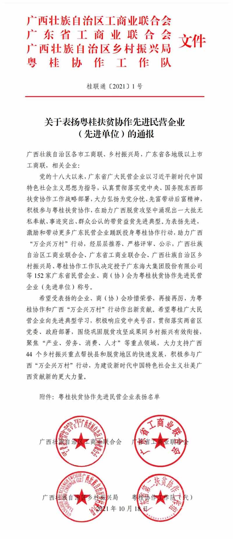 會上,廣西自治區政府副秘書長、粵桂協作工作隊領隊鄺兵宣讀了《關于表揚粵桂扶貧協作先進民營企業(先進單位)》的通報,表揚152家粵桂扶貧協作先進民營企業、商協會。