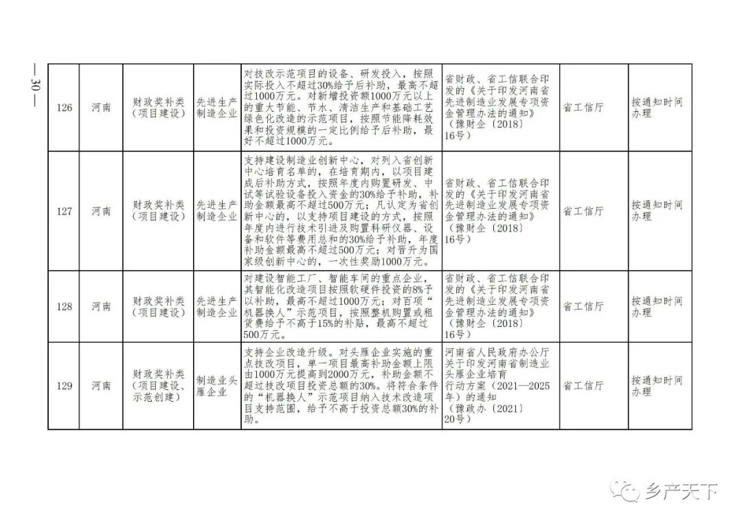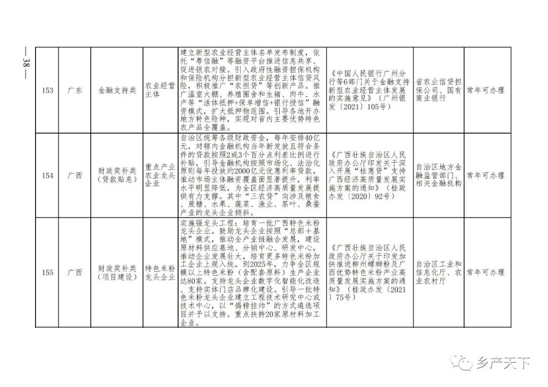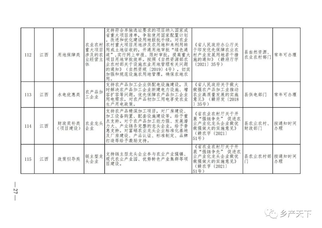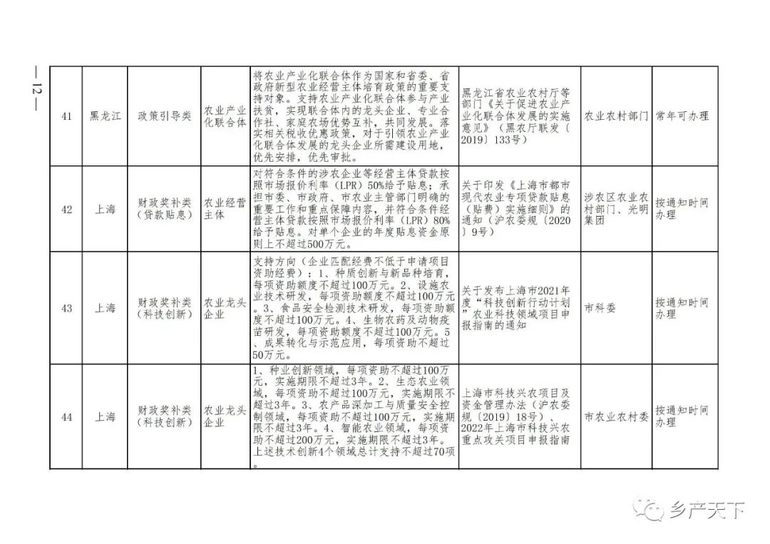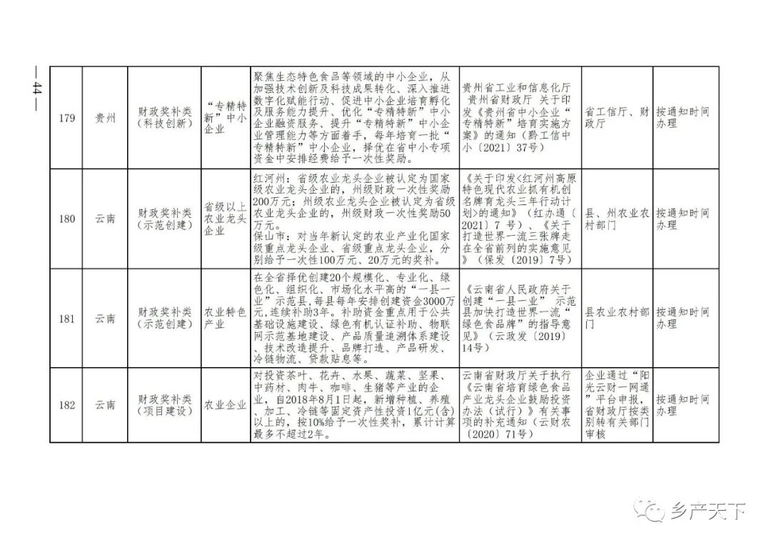 摘要:?為加強對農業產業化龍頭企業的精準服務,農業農村部鄉村產業發展司收集了各省(區、市)對龍頭企業的支持政策,于近期印發《農業產業化龍頭企業支持政策清單》(簡稱《清單》),供各地互相參考學習。《清單》按照“政策類別、支持對象、具體內容、政策依據、辦理部門、辦理時間”進行梳理,共涉及“財政獎補、金融支持、用地保障、稅費減免、水電優惠、政策引導”等六大類229條政策。《清單》通知,各地支持政策發生變化,要及時反饋,鄉村產業發展司將定期更新發布。農業產業化龍頭企業支持政策清單...