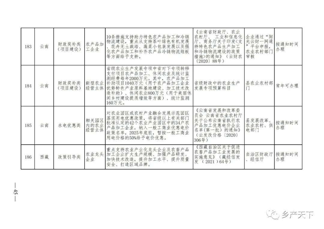《清單》按照“政策類別、支持對象、具體內容、政策依據、辦理部門、辦理時間”進行梳理,共涉及“財政獎補、金融支持、用地保障、稅費減免、水電優惠、政策引導”等六大類229條政策。《清單》通知,各地支持政策發生變化,要及時反饋,鄉村產業發展司將定期更新發布。